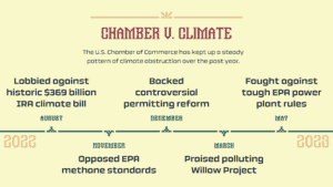 The Chamber’s anti-climate positions are increasingly out of step as climate-fueled catastrophes are more frequent and severe. The association’s opposition to historic climate legislation and environmental regulations over the last year prove that they continue to be a major political obstacle to climate progress. That’s why ClimateVoice is calling on pro-climate member companies to Escape the Chamber now.