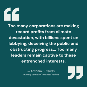 Furthermore, thousands of oil, gas and coal lobbyists continue to gain unprecedented access to the Conference of Parties (COPs), blocking urgent climate action. In his speech at COP30 in Belem, Brazil, Secretary General of the United Nations Antonio Guterres noted: “Too many corporations are making record profits from climate devastation, with billions spent on lobbying, deceiving the public and obstructing progress… Too many leaders remain captive to these entrenched interests.”