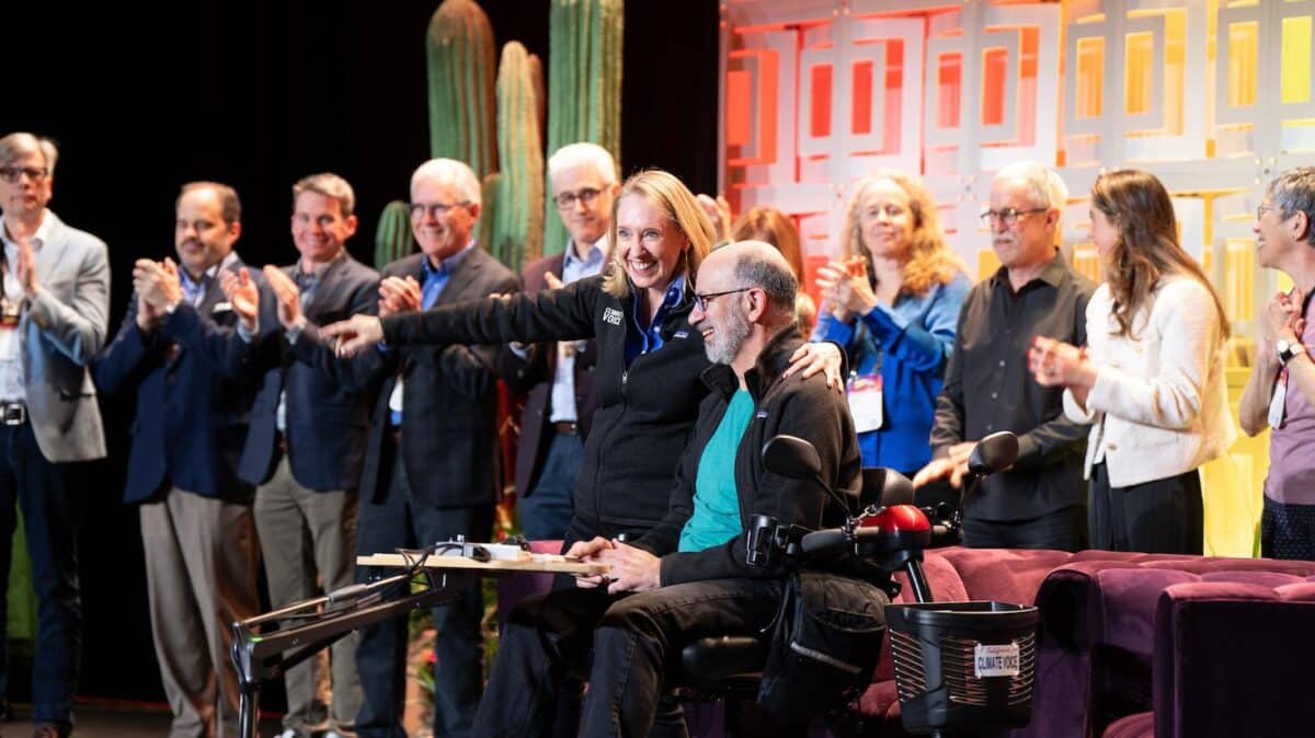 But Weihl has moved on in several important ways. He left the private sector to found the nonprofit ClimateVoice in 2020. Not long after, he was diagnosed with ALS, a debilitating and progressive disease. He requires a wheelchair and he can no longer speak. But that has not kept him from communicating. AI has been used to clone his voice — with incredible fidelity — and deliver his speech as he faces the audience. His message is to go beyond internal sustainability measures, beyond business as usual, and use their influence to support public policy that addresses climate change.